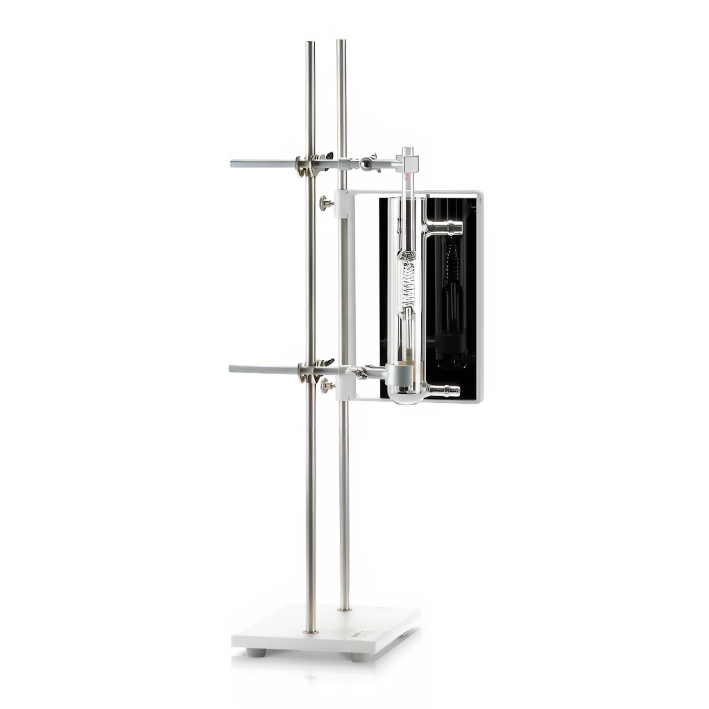 El sistema SSP mide el punto de fusión de una muestra de supositorio bajo condiciones controladas, siguiendo procedimientos farmacéuticos estándar. El dispositivo consiste en una cámara de vidrio que funciona como columna de ensayo, integrada en una probeta graduada, y rodeada por un revestimiento que alberga un baño de agua o fluido térmico.