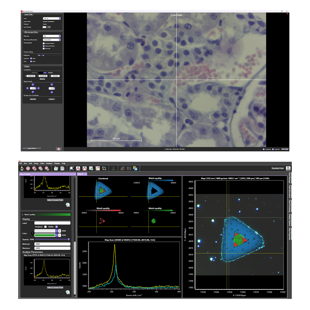 Software Ramacle® para control completo del sistema, adquisición de datos, análisis, tratamiento de espectros y generación de mapas Raman 2D/3D; compatible con librerías analíticas como KnowItAll™.